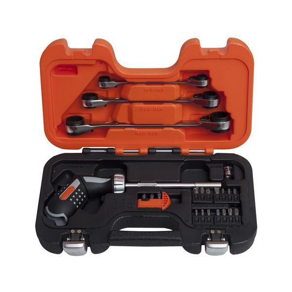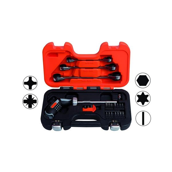 This robust and durable 25 piece ratchet bit and wrench set from Bahco offers their usual durability and thoughtful design. The screwdriver features a swivel action that can be locked in a straight or pistol shape to allow easy action in tighter areas or maximum torque transmission. It also features a bit block built into the rear to help minimize your load on the move. Also in the set are 3 of the most commonly used sized ratchet spanners that benefit from a 12 point Dynamic-Drive that ensures longer life for screws, nuts and only needs 5 to work.