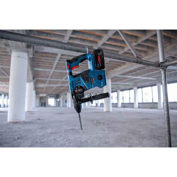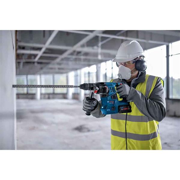 This rotary hammer is ideal for hammer drilling in concrete, stone, and masonry. It is compatible with all batteries and chargers in the Bosch Professional 18V System. For a dust-free and safer work environment, the GDE 18V-16 Professional dust extractor can be easily attached. Also compatible with AMPShare, the multi-brand battery alliance.