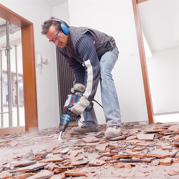 The GSH 7 VC Professional from Bosch is exceptionally powerful with low weight and good vibration damping. This SDS-max Demolition Hammer is driven by a 1500 Watt motor, works with an impact energy of 13 joules and weighs only 8.5 kg. Due to its optimized ratio of power to weight, the GSH 7 VC Professional relieves the strain on professional tradespeople, especially when performing tiring work such as horizontal or overhead chiselling. These demanding tasks, such as removing tiles, can, therefore, be done both quickly and efficiently. The vibration damping system also contributes to the comfortable use of the tool: the demolition hammer achieves low vibration of only 9.5 m/s² thanks to its optimized hammer mechanism and decoupled main and side handles. As a result, the permitted operating time is more than two hours per day. The GSH 7 VC Professional to deliver consistent performance even under load, this ensures fast work progress.