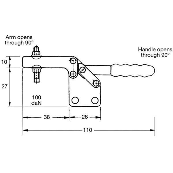 Features: Horizontal Clamps are usually used where height restrictions prevent the use of a vertical clamp, or where the action of the clamping arm and handle rotating in opposite directions is more suitable.