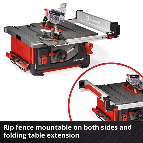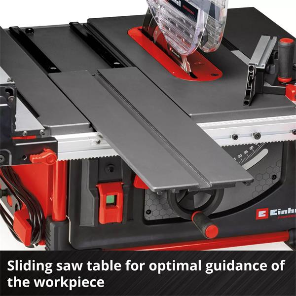 The Einhell Professional TP-CC 10 T table saw features a sliding table, making it an indispensable tool for any workshop. The smooth-running sliding carriage makes it possible to saw even larger workpieces with precision. With 2,000 watts of power and a carbide-tipped Ø 254 mm blade, this is table saw you can rely on when working with wood. Whether you need to trim plywood and panelling, or cut joists and planks to length: the table saw handles any job thanks to 85 mm cutting height and its 45°-tiltable and height-adjustable blade. The cast aluminium work table with height-adjustable table insert with fine adjustment provides a stable, level support. The rip fence can be mounted on either side, with two mounting options on the right side, and can be adjusted precisely by means of a rotary knob. The rip fence has a foldable system that allows it to function as a table extension, but can also be attached right next to the saw blade for very narrow cuts. The solid aluminium angle stop has a 15° guide grid. The angle stop can be mounted on the sliding table and used to push the workpiece at a precise angle. The two-piece blade guard offers the advantages of optimal visibility of the cutting area and safety during operation. If the working area needs to be kept clean, any Einhell wet and dry vacuum cleaner can be connected to provide suction via the extraction adapter. The saw has a soft start function to protect both the motor and the fuses. The sturdy steel frame construction with rubberized feet ensures secure positioning of the table saw with low vibration, while multiple transport handles, a cable winder and brackets for all attachments and accessories facilitate transport.