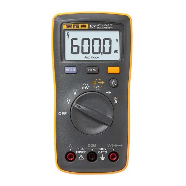 The Fluke 107 is a compact, palm size easy-to-use digital multimeter made to fit the way you work. It is the perfect first-pass troubleshooting tool; small enough to fit in a shirt pocket yet tough enough to withstand daily use, including a 1-meter drop test. For everyday applications where true-rms accuracy isn’t needed, the Fluke 107 delivers reliable measurements time after time. With a CAT III 600 V safety rating, you don’t need to compromise safety. The Fluke 107 offers a comfortable grip, weighs only 200 g, and is easy to carry.