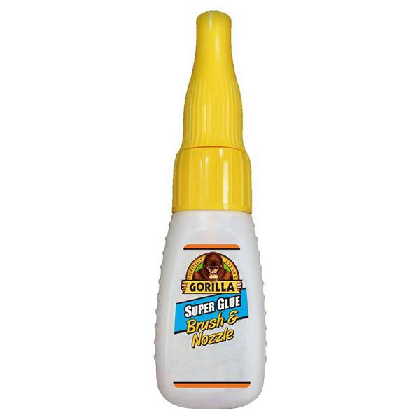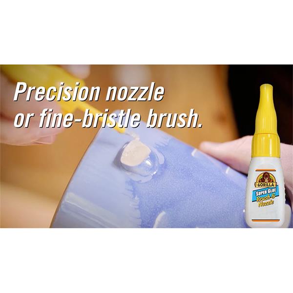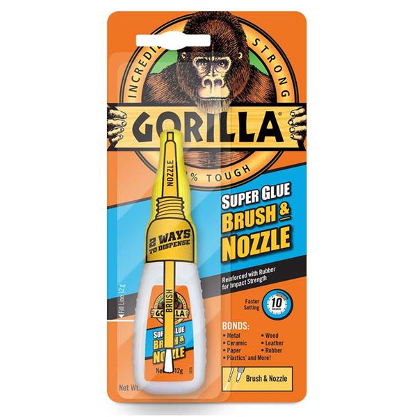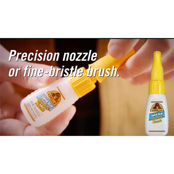 Gorilla Super Glue Brush and Nozzle offers 2 easy ways to dispense for control and accuracy. Brush and Nozzle features a precision tip nozzle and fine bristle brush that allow the user to control their super glue application, making it perfect for any project. Developed for long-lasting repairs in an instant, Gorilla Super Glue dries in 10–45 seconds and is reinforced for increased impact resistance. We call it Impact-Tough because it stands up to wear and tear. In addition to its high-performance formula, we’ve added an anti-clog cap with a metal pin inside to ensure an airtight seal for maximum reusability. Super glue, also referred to as cyanoacrylate glue, or CA glue works on a variety of materials.