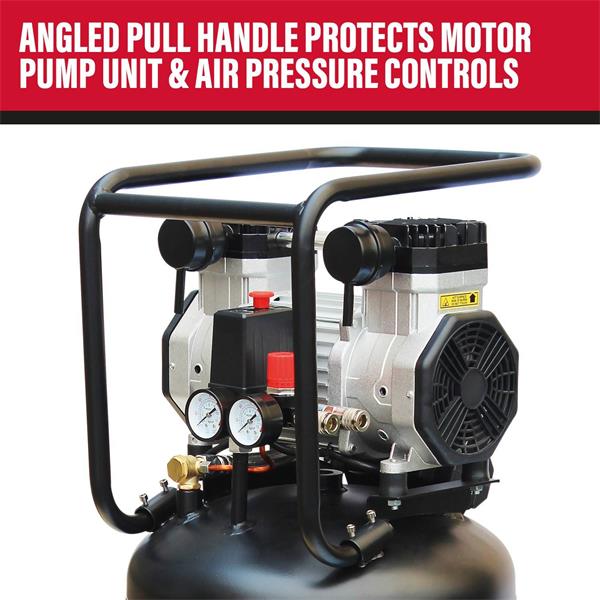 Operating at a low 67dB, it's ideal for work areas where maintaining a low noise level is a consideration. This oil-free and low maintenance compressor delivers 13.6CFM piston displacement resulting in 9CFM Free Air Delivery (FAD) for a consistent air supply ideal for inflation tasks, nailing, stapling and airbrushing.